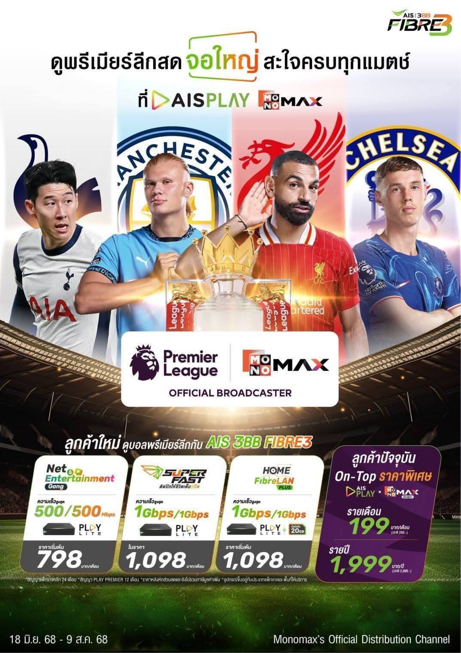 ชมสดพรีเมียร์ลีกครบทุกแมตช์มากถึง 11 ช่อง พร้อมพากย์ไทยครบทุกแมตช์ ที่ AIS PLAY และ MONO MAX และชมหนัง ซีรีส์ ทั้งอินเตอร์ จีน เกาหลีและญี่ปุ่น พากย์ไทยครบทุกตอนที่ MONOMAX